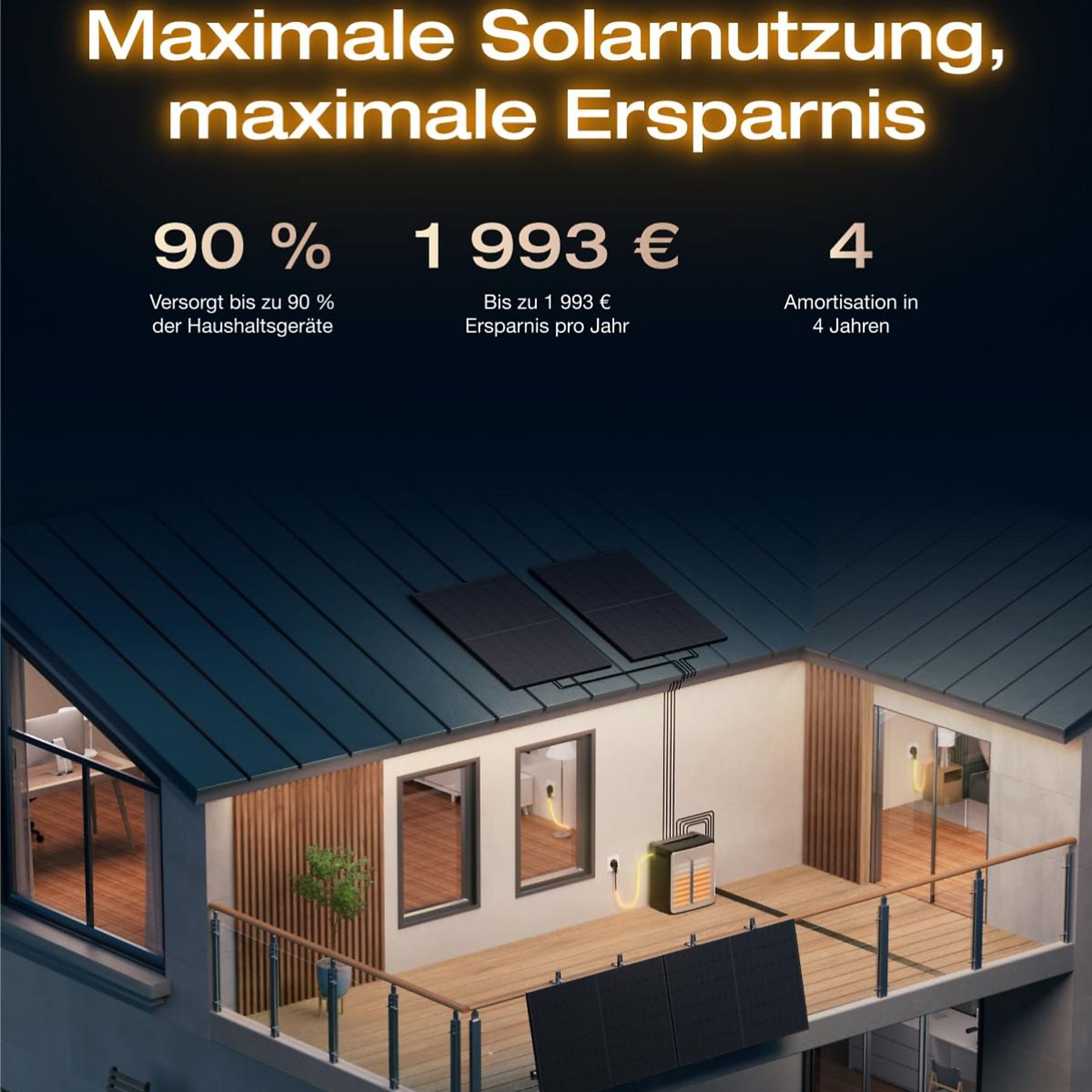 Bis zu 1993 € Einsparungen pro Jahr dank 2000 W Solareingangsleistung mit 4-MPPT-Design und zusätzlichen 800 W über angeschlossene Mikro-Wechselrichter. Zwei Wechselstromausgänge (1200–2300 W) versorgen 99 % aller Haushaltsgeräte mit Strom – vom Kühlschrank bis zur Kaffeemaschine.